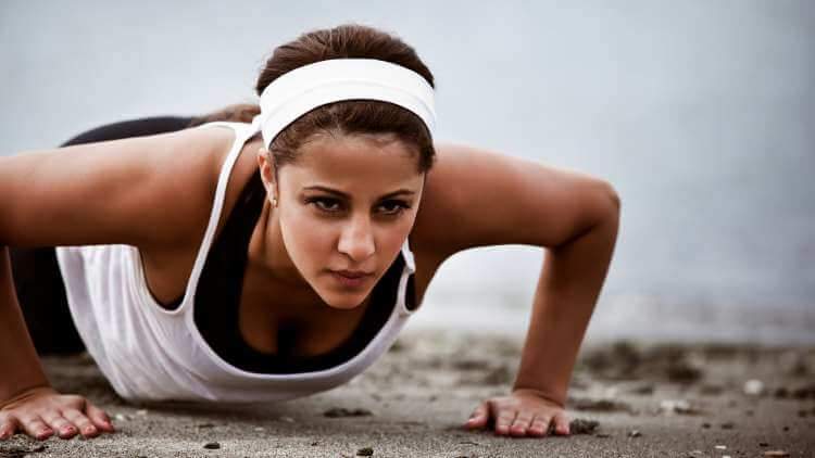 2. Push up – With your hands and feet shoulder-width apart, bend your elbows and lower your chest to the ground. Push against the floor, raising your body until your arms are straight again.