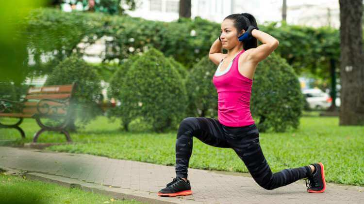 - Bend the front knee and lower your body downward, until your thigh and calf are at a 90-degree angle. Take care not to go beyond this point as it can place excess strain on the knee joint.